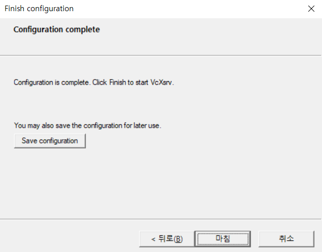 vcxsrv 가 설치 완료되면 실행시킵니다. (vcxsrv 검색해서 설치해도 됩니다. sourceforge.net 들어가서 다운로드하고 설치하는 과정을 위의 명령어 한 줄로 가능합니다. chocolatey 너무 좋아요 :) )