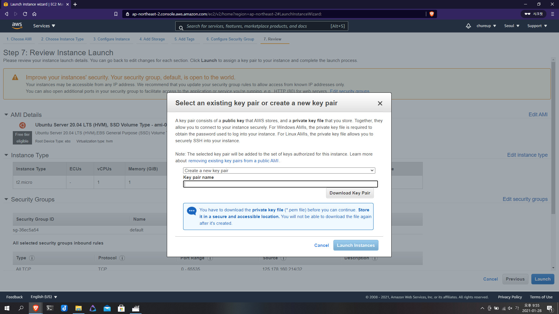 이때 서버로 접속할 수 있는 키를 발급해주는데 다운로드하여서 잘 갖고 계셔야 합니다. 키가 유출되지 않도록 주의해주세요. 키가 유출돼서 누군가 제 서버에 접속해서 헤집어 놓을 수도 있습니다.