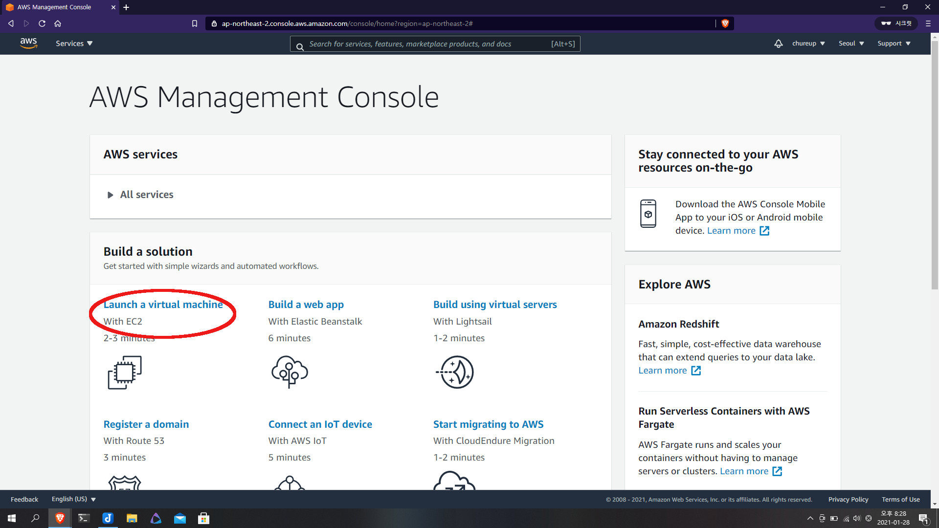 처음 회원 가입하면 무료로 1년 동안 기본 사양의 가상 컴퓨터 한 대를 발급받을 수 있습니다.