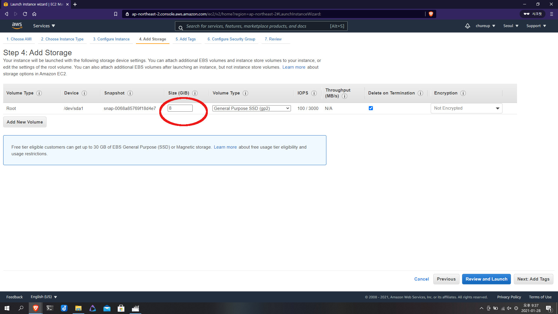 기본으로 8GB가 할당되어 있는데 30GB까지는 무료이므로 원하시는 만큼 설정하시면 됩니다.